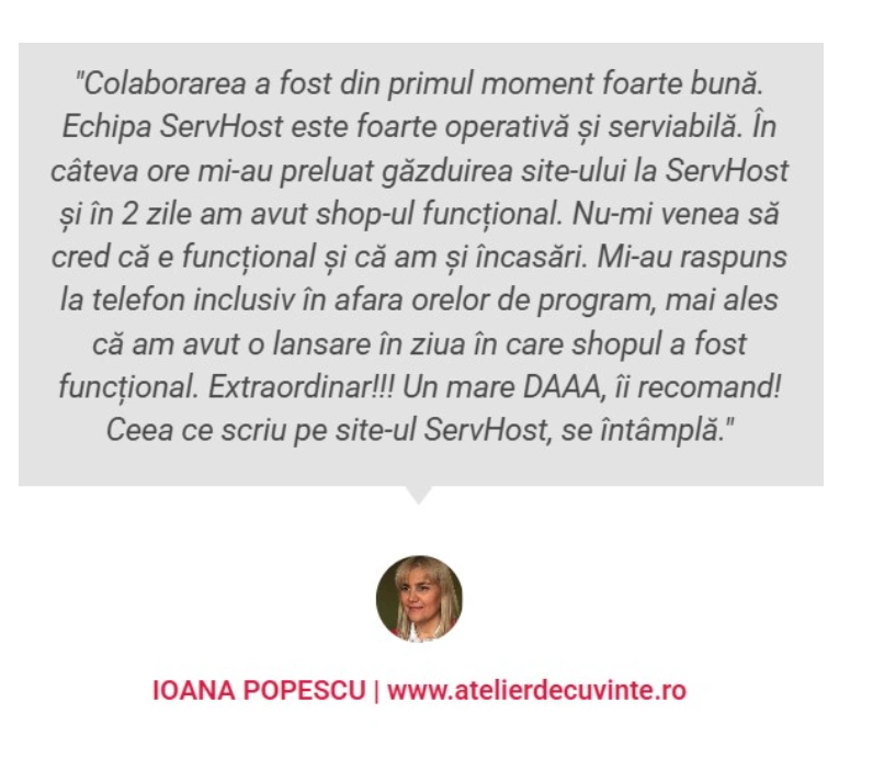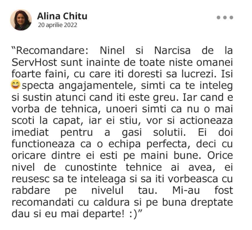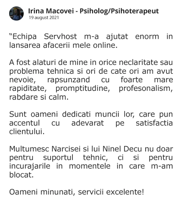 Cu peste 11 ani experienţă în vânzări B2C de servicii telecom, în companii multinaţionale, și 8 ani experienţă în zona online ceea ce m-a ajutat sa dezvolt compania SERVHOST.