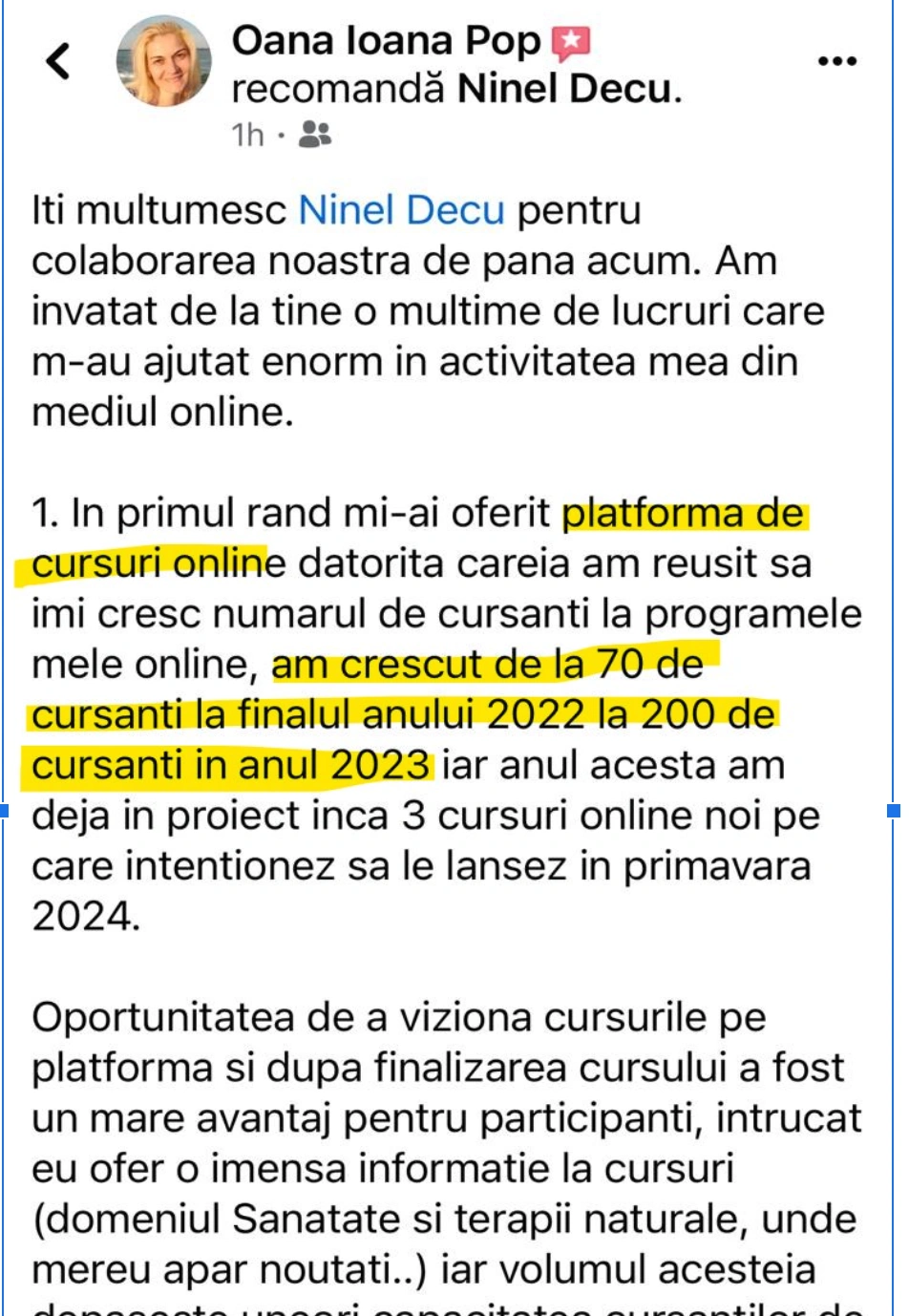 În paralel, am dezvoltat servicii de training şi consultanţă 1 la 1, precum şi o multitudine de resurse educaţionale pe tema iniţierii şi promovării afacerilor online (cursuri, ghiduri, webinarii, articole).